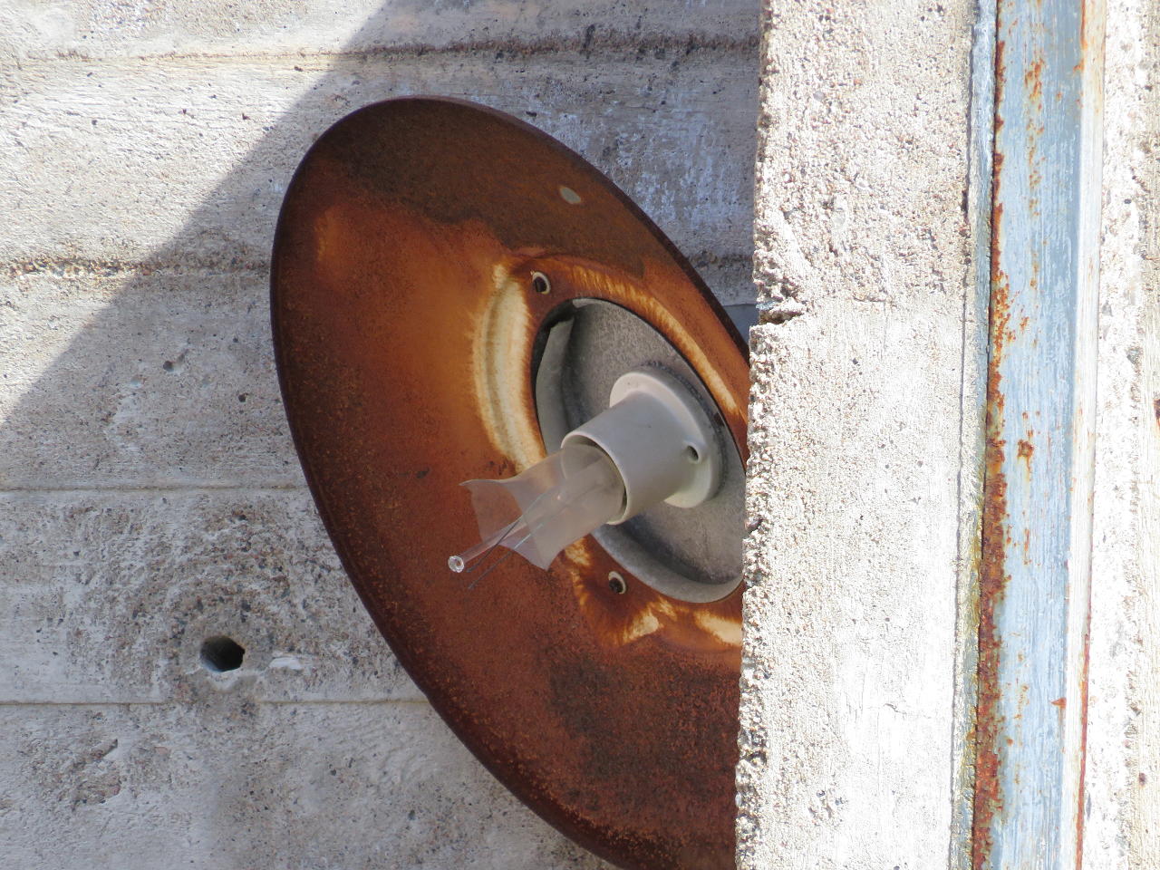 Löytyi varrellinen peltihattuinen valaisin, minkä tyyppi on 4314 250V 75W kaksi pisaraa, mutta valmistajan nimeä, tai logoa ei ole. Varren alaosassa on erikoinen pylväs rasia, jonka kiinnityskorvat on pylvästä myötäilevät. Siinäkään ei lue mitään ja on vain pisara kolmiossa.